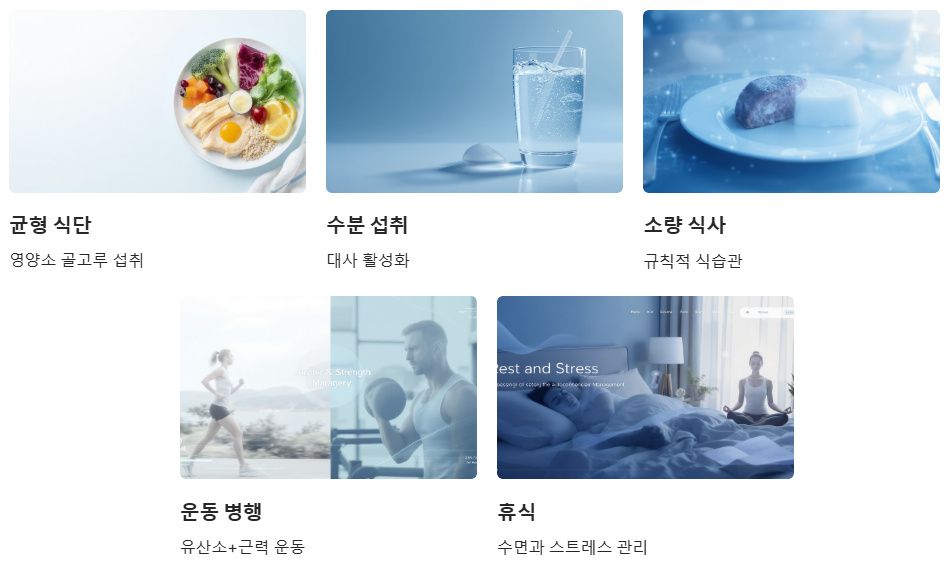 - 근력 운동(스쿼트, 푸쉬업 등): 근육량을 늘려 기초대사량을 높입니다.