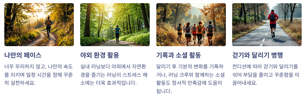 - 달리기 후 기분의 변화를 기록하거나, 러닝 크루와 함께하는 소셜 활동도 정서적 만족감에 도움이 됩니다.