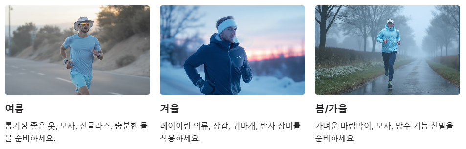 도심이나 인적이 드문 곳보다는 평소 익숙하고 안전한 코스를 선정하세요. 미세먼지가 심한 날, 한파나 빙판길이 많은 계절에는 실내 러닝머신을 병행하는 것도 안전관리 방법입니다.