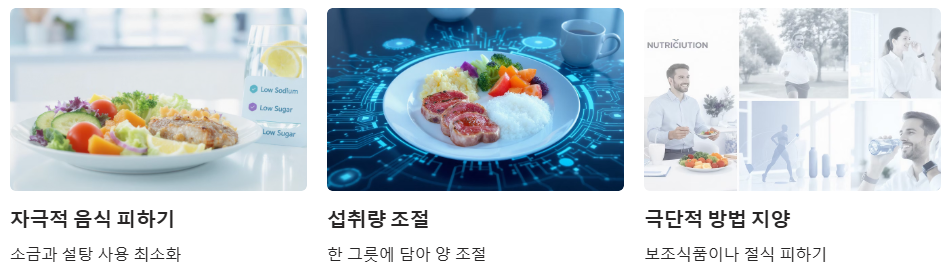 - 짜거나 자극적인 음식은 피하고, 소금과 설탕 사용을 최소화합니다.