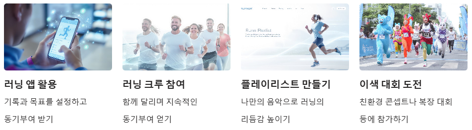 - 러닝 크루·동호회 참여: 함께하면 지속적으로 동기부여가 되고, 러닝이 더 즐거워집니다.